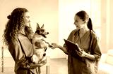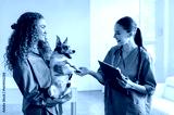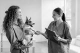 Dog held by its female owner during vet consultation, with friendly veterinarian taking notes, illustrating positive veterinary visit and pet care interaction