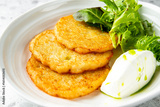 Golden brown potato pancakes served with sour cream and green salad on a white plate, top view, isolated on white background, appetizing vegetarian dish.