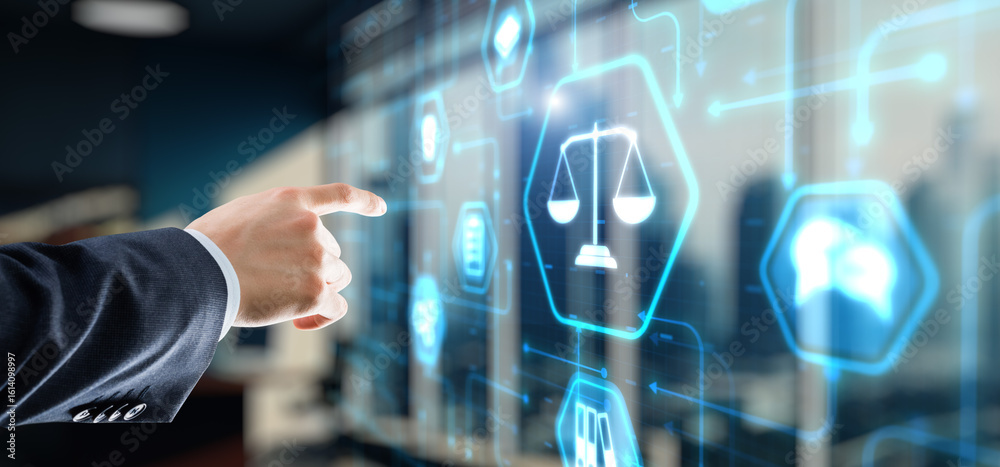 Justice and law concept. Icon Law on virtual screen. Blurred background