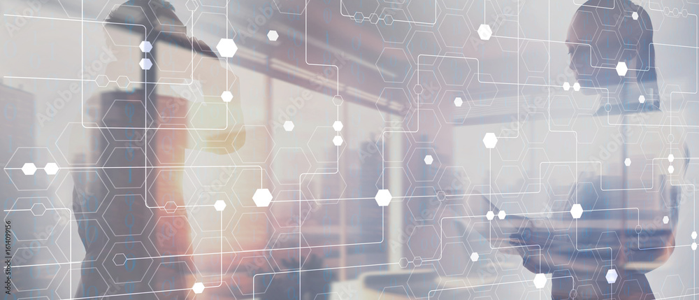 Technology industrial business process workflow organisation structure on virtual screen. Honeycombs and binary code