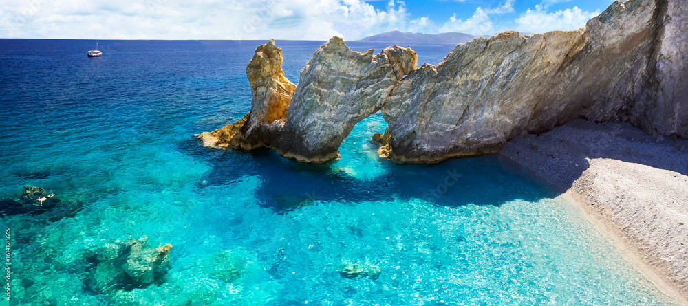 Best iconic beaches of Greece, Sporades - beautiful Lalaria beach with turquoise sea and arc rocks formation. Greek summer destinations.