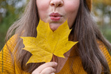 Happy mature woman with fall leaf in hand, Elegant senior lady, park background, vibrant aging, healthy lifestyle, enjoying autumn nature, golden season