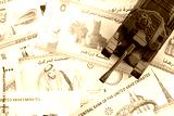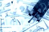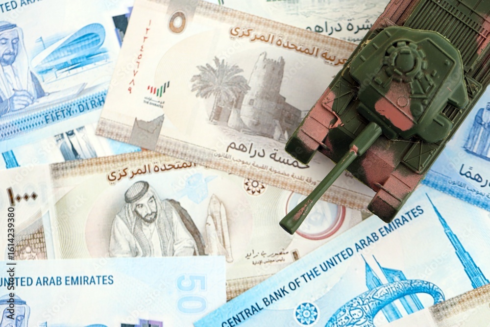 United Arab Emirates dirham currency money bills and toy tank. The concept of army funds and weapons sales
