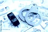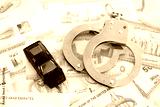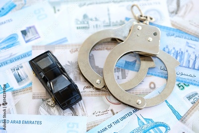 United Arab Emirates dirham currency money bills and toy car with handcuffs. The concept of car accident