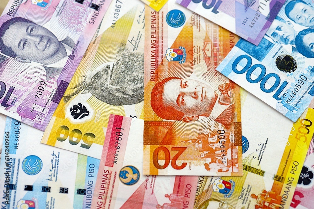 Philippines peso currency money bills. The current banknotes lies on table in big amount