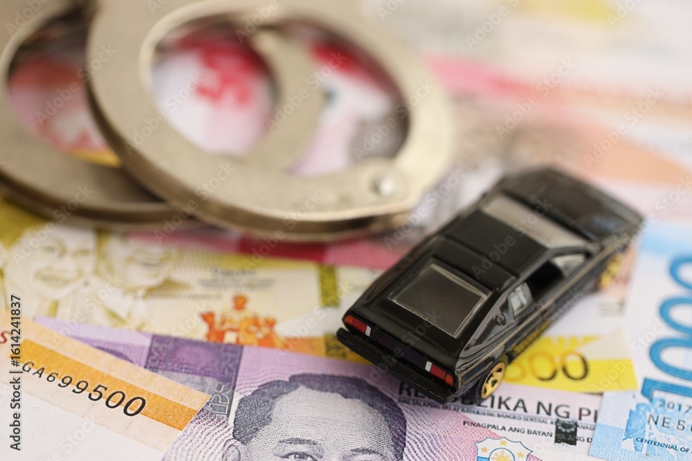 Philippines peso currency money bills and toy car with handcuffs. The concept of car accident