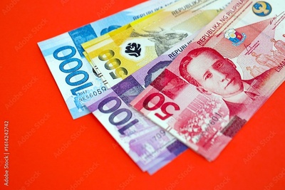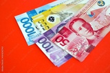 Philippines peso money bills in big amount on red. Finance and banking concept