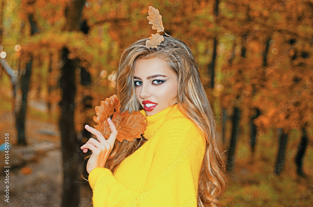 Woman with autumn leaves. Woman near autumn fall leaves in park. Girl on autumnal fall background. Foliage, falling leaves background, autumn leaf and people concept. Autumn portrait.