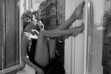 Sexy model enjoying her morning coffee at balcony. Perfect woman legs. Sexy girl in living room at home. Beautiful and sexy female body. Sexy woman with cup coffee near window.