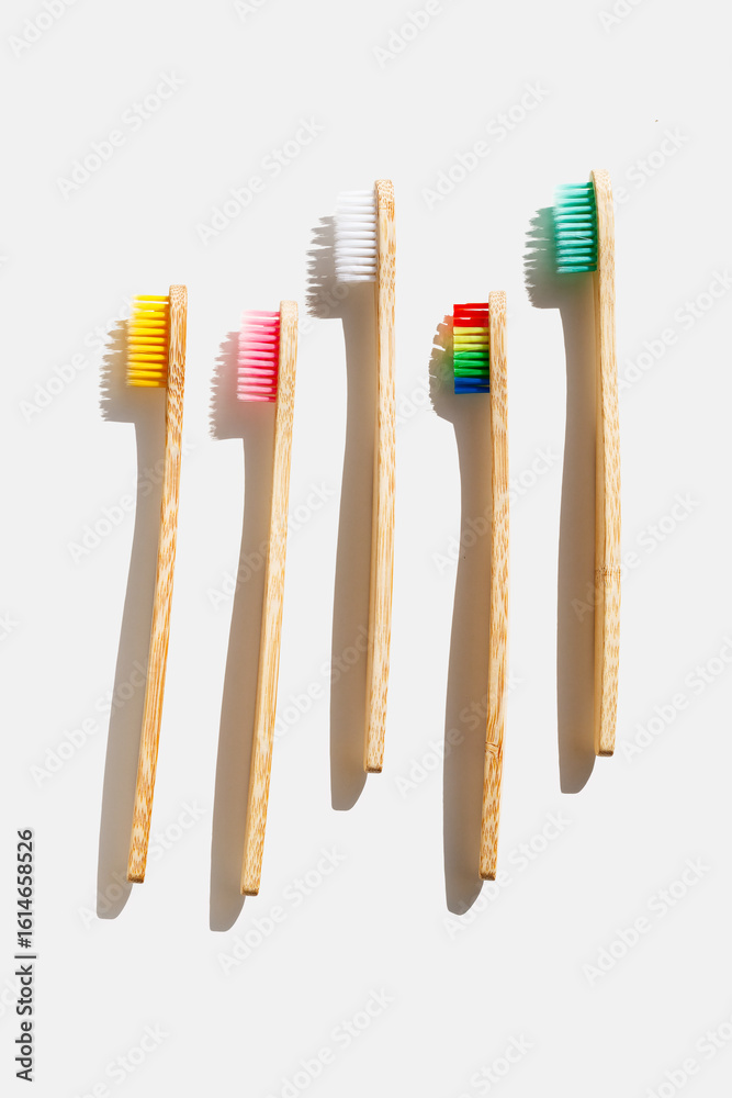 Aesthetic Beige bamboo toothbrushes with colors bristles at sunlight on light grey background. Simplicity, hygiene, and environmentally friendly alternatives, top view photo, minimal style flatlay