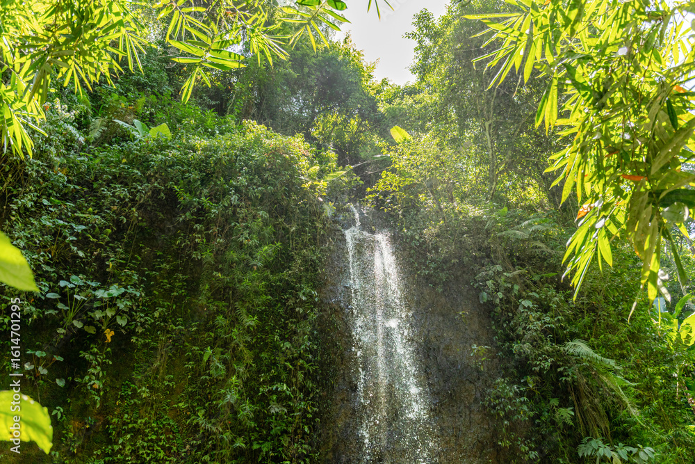 A stunning waterfall cascades over rocky terrain in lush greenery