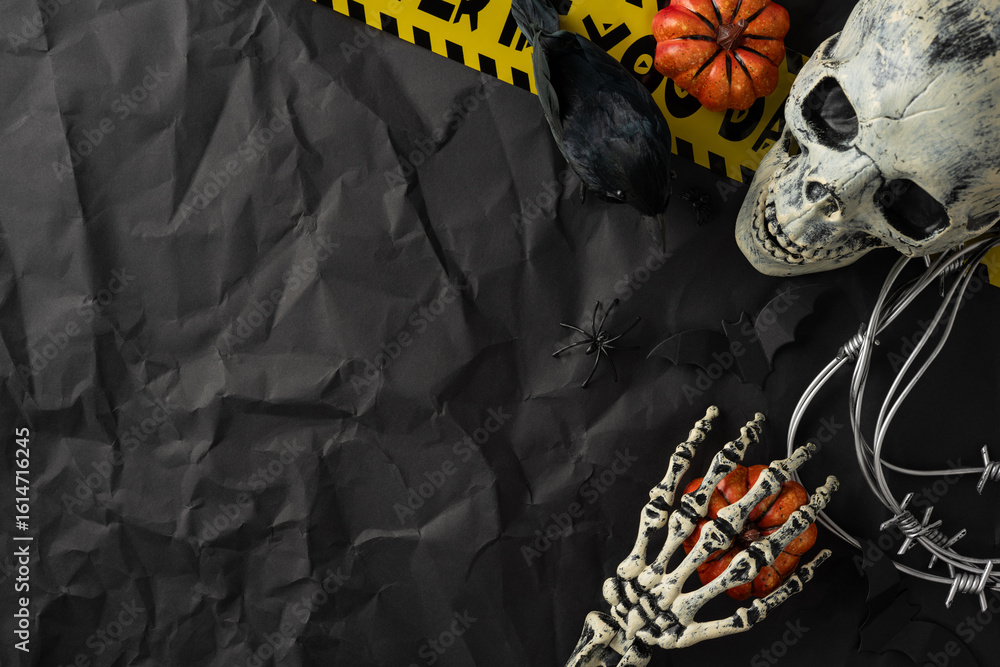 Halloween composition showcasing a spooky skeleton theme, featuring skulls, pumpkins, and black decorations