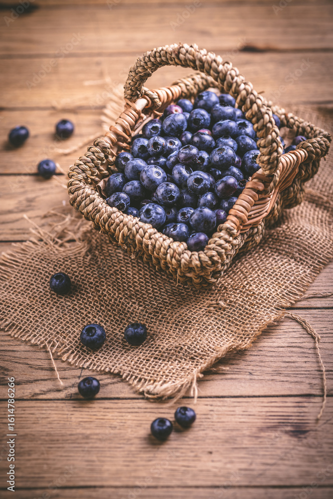 Fresh organic blueberries in basket on wooden background. Healthy food concept, juicy wild forest berries