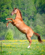 Beautiful red horse rearing up at sunset in summer