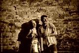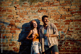 Happy couple of festival goers using cell phone against brick wall.