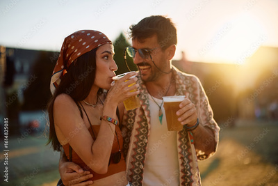 Happy couple of festival goers drinking during music concert in summer.