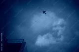 A blue sky with a plane flying in it. The sky is dark and cloudy. The plane is flying low to the ground