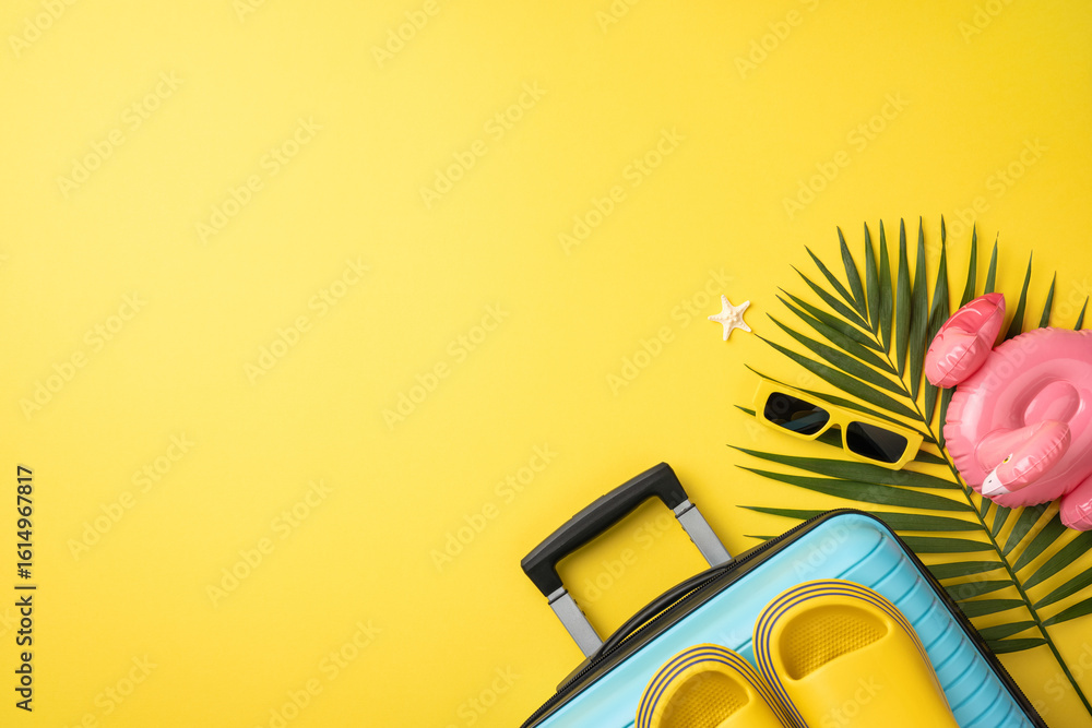 Vacation essentials on yellow background featuring suitcase, sandals, sunglasses, tropical leaves, and flamingo