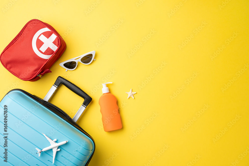 Flat lay featuring a suitcase, sunglasses, first aid kit, sunscreen, on a bright backdrop