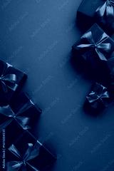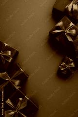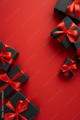 Decorative vertical gifts wrapped in black paper with red satin bows arranged over a vibrant red surface