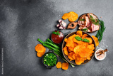 Potato chips with bacon in a ceramic bowl. Salty snacks for beer.