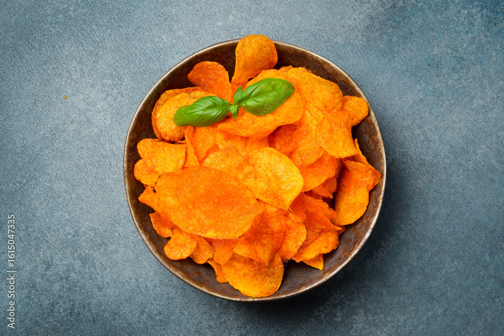 Beer snacks. Ceramic bowl with potato chips. Top view, on a stone background.