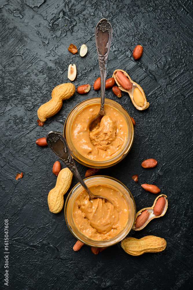 Peanut butter in glass jar and spoon. Roasted peanuts in the shell. American dessert concept. Homemade nut butter. Vertical photo.