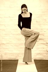 Studio photo of young female model wearing simple beautiful outfit, black shirt and beige wide leg trousers