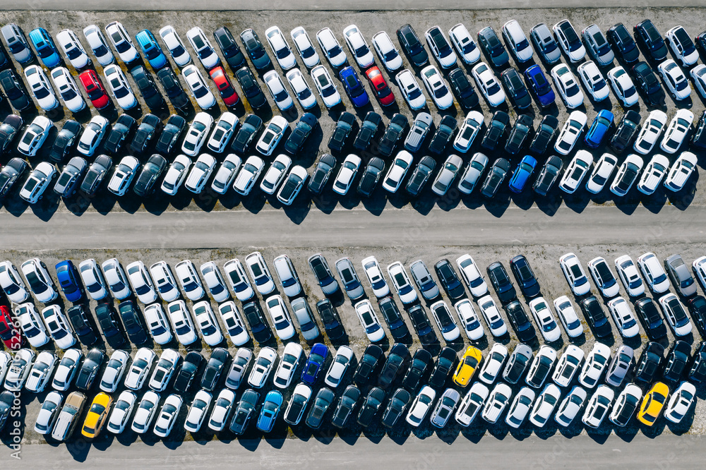 Aerial drone view of Parking lots. New hybrid or electric cars storage area. Many colorful cars parked in a rows