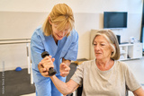 Senior woman in rehabilitation session assisted by caregiver with physical exercise