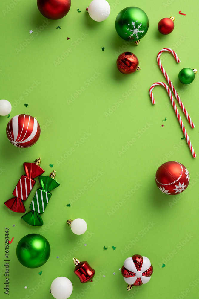 Christmas-themed vertical ornaments, red and green candies, and decorations perfectly laid on a lively green surface for holiday cheer