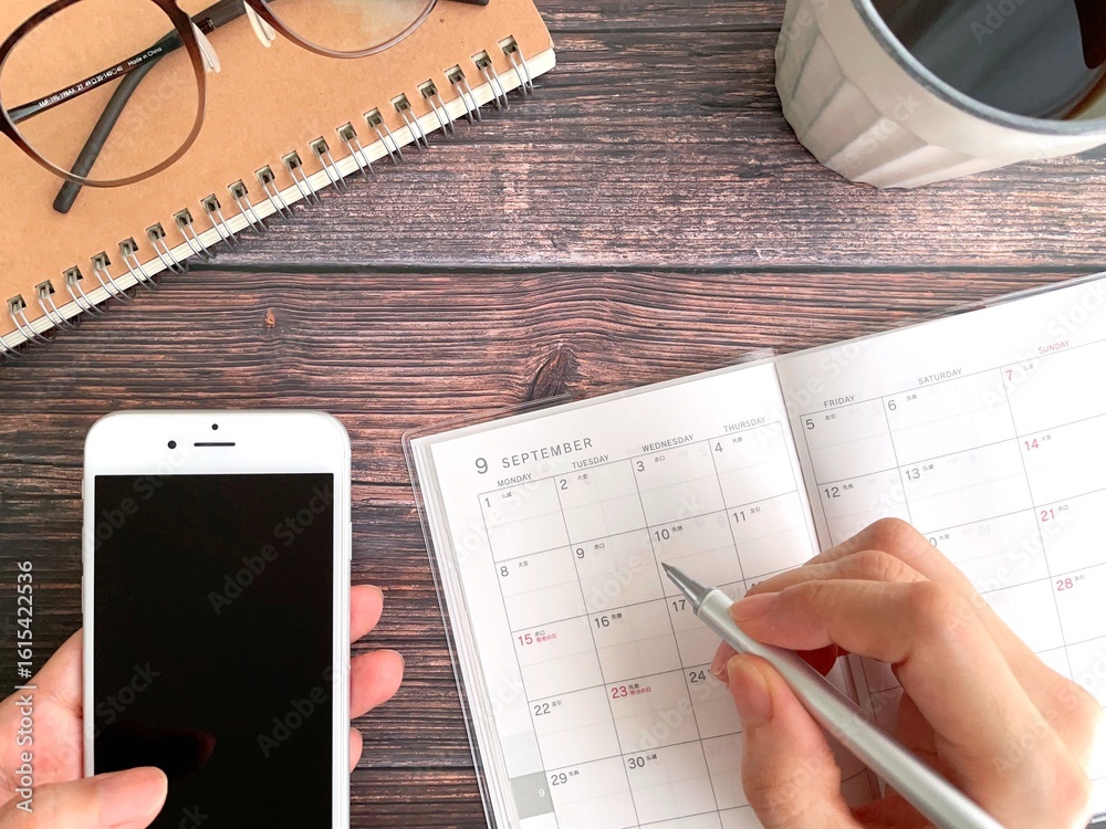 スマホを持って9月のスケジュール帳に記入する女性の手元