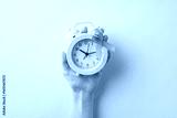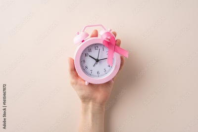 Pink alarm clock held in hand adorned with a symbolic pink ribbon and simple background