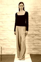 Studio photo of young female model wearing simple beautiful outfit, black shirt and beige wide leg trousers