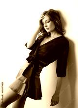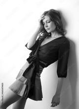 Female model wearing black blouse and beige mini skirt. Stylish and elegant outfit. Fashion Studio shot.