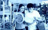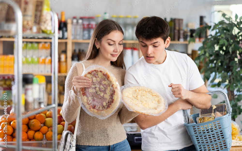 Couple young man and woman buyers chooses frozen pizza in grocery store..