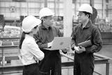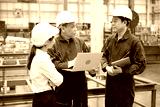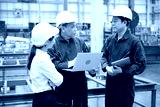 Engineers or workers working on laptop computer and checking product in the metal sheet factory