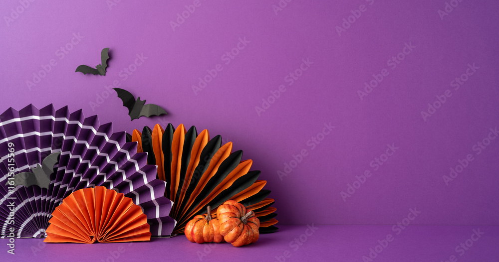 Halloween side view scene showcasing black and orange paper fans, miniature pumpkins, and decorative bats on a solid purple background, emphasizing a festive holiday atmosphere