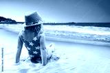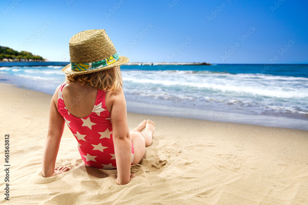 Girl in a swimsuit in a summer hat sittinh and playing on the beach with the sea and a sandy beach in the background.