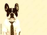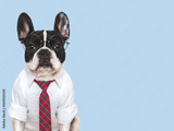 Cute puppy, white shirt and red tie. Close-up, isolated background. Studio shot, day light. Concept of care, education, obedience training and raising of pets