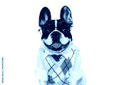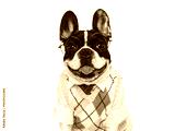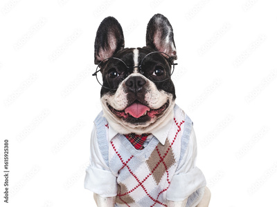 Cute puppy, wool vest and red tie. Dog smile. Close-up, isolated background. Studio shot, day light. Concept of care, education, obedience training and raising of pets