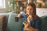 A woman with auburn hair relaxes on a couch, holding a black cup of coffee in one hand and looking at her smartphone with a smile. The cozy living room has plants and warm decor.