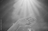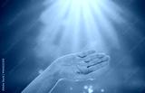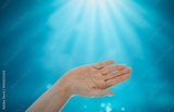 Female hands in natural soft pose to highlight skincare and cosmetic product use, showcasing hand creams, lotions, serums, or other beauty treatments Blurred water blue and light flare background.