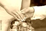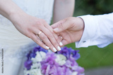 Hands of just married couple with golden wedding rings and sweet pea flowers at the background