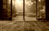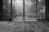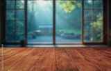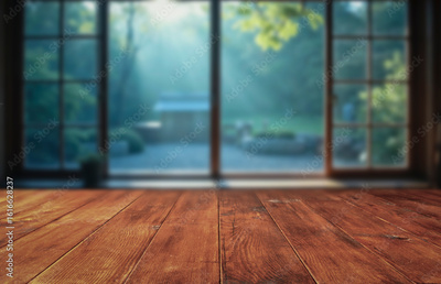 Minimalist empty wooden table in serene Japanese-style interior. Large window with blurred view of lush green garden outside. The natural light and peaceful ambiance with showcasing product space.