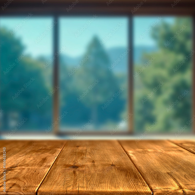 Minimalist empty wooden table in serene Japanese-style interior. Large window with blurred view of lush green garden outside. The natural light and peaceful ambiance with showcasing product space.