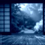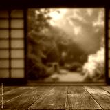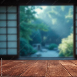 Minimalist empty wooden table in serene Japanese-style interior. Large window with blurred view of lush green garden outside. The natural light and peaceful ambiance with showcasing product space.