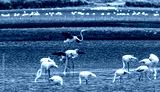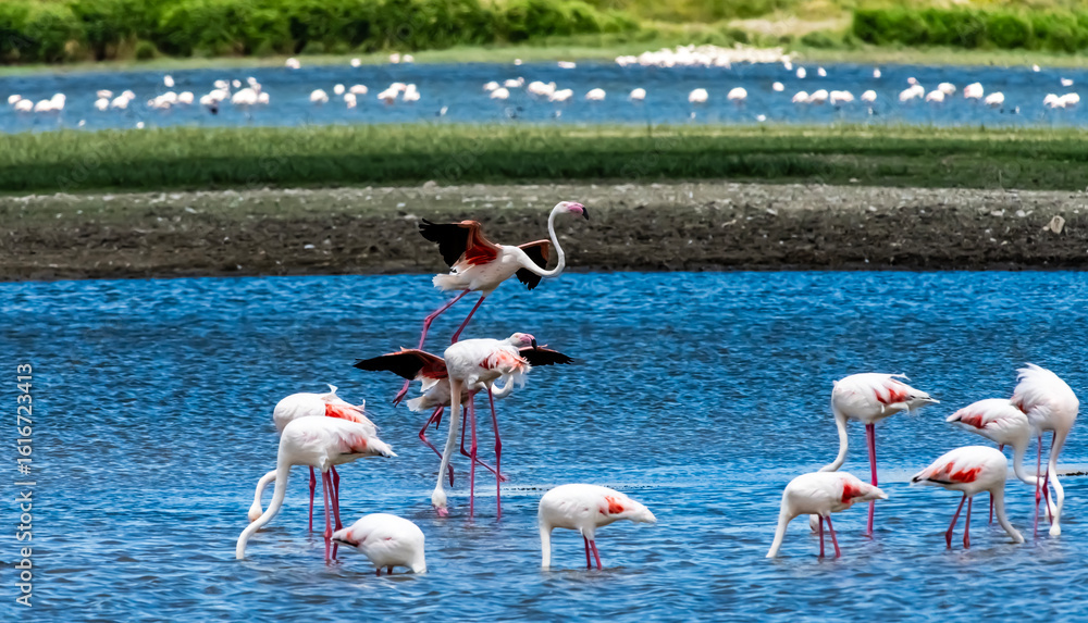 A serene flock of greater flamingos wading and socializing in shallow wetlands on a sunny day, showcasing the beauty of bird migration and nature's peaceful rhythm in high resolution.