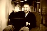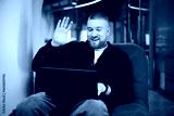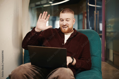Caucasian young man sitting on chair waving hand while video chatting on laptop smiling and looking at screen in modern office environment