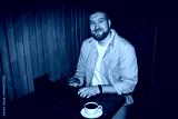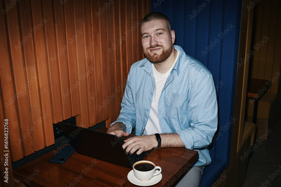Portrait of Caucasian young adult man smiling while working on laptop at table in modern coworking booth, looking into camera with coffee cup and smartphone on wooden surface